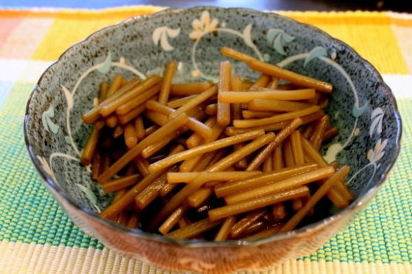 醤油に漬けておいた、椎茸と昆布を細く切って味醂や砂糖を混ぜて気長に煮詰めたのを「きゃらぶき」といって、黒い蕗の意だそうです。山蕗はアクが強く、この苦味がきゃらぶきの旨みで、ご飯やお酒の当てに最高です。